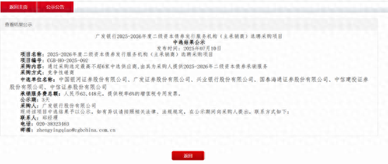 财联社查询了解,广发银行于今年6月16日发布的“2025-2026年度二级资本债券发行服务机构(主承销商)选聘采购项目进行竞争性磋商采购”项目,拟通过采购选定最高不超6家中选供应商,由其为广发银行提供2025-2026年二级资本债券承销服务。