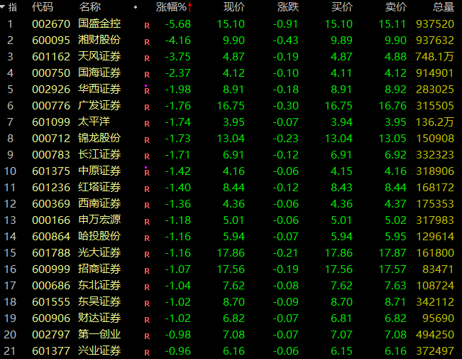 银行、券商、保险等大金融股早盘集体走弱,券商股与银行股大部份股票飘绿。国盛金控跌超5%,湘财股份、天风证券、紫金银行、青岛银行、苏州银行、中国人保、天利科技等跟跌。